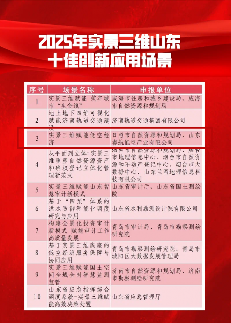 近日,由山東睿航低空產(chǎn)業(yè)有限公司聯(lián)合日照市自然資源和規(guī)劃局申報(bào)的《實(shí)景三維賦能低空經(jīng)濟(jì)》項(xiàng)目,在2025年實(shí)景三維山東創(chuàng)新應(yīng)用評(píng)選中脫穎而出,斬獲全省十佳第三名的優(yōu)異成績(jī)。
