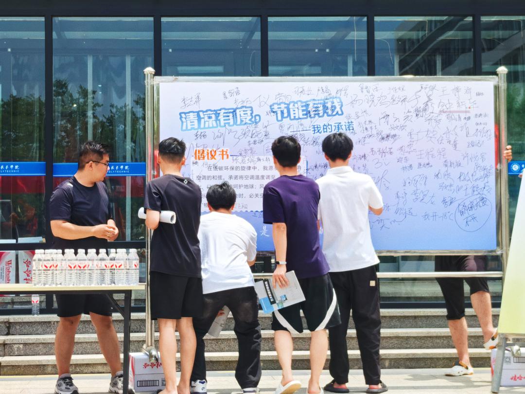 在空調(diào)系統(tǒng)穩(wěn)定運(yùn)行后,項目團(tuán)隊在校園內(nèi)舉辦“科學(xué)用空調(diào),低碳過夏天”主題活動?,F(xiàn)場展板化身“知識課堂”,通過“26℃黃金溫度”“每調(diào)高1℃省電7%—10%”等實用內(nèi)容,向師生普及科學(xué)用空調(diào)技巧與健康要點。在“清涼有度,節(jié)能有我”承諾墻上,近千名師生鄭重簽名,許下“空調(diào)溫度不低于26℃”“外出使用節(jié)能模式”等承諾,將倡議轉(zhuǎn)化為行動自覺。活動以互動形式強(qiáng)化節(jié)能意識,獲師生廣泛好評。未來,項目團(tuán)隊將持續(xù)開展低碳宣傳,推動節(jié)能理念融入校園日常,攜手共建綠色、低碳、和諧校園。