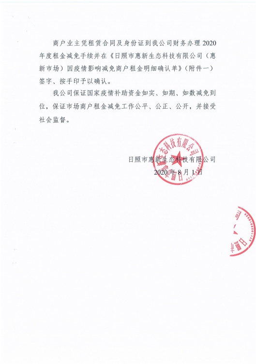 新冠病毒疫情期間惠新智慧綜合市場商戶租金減免方案